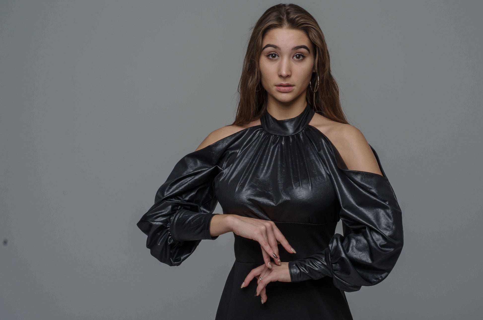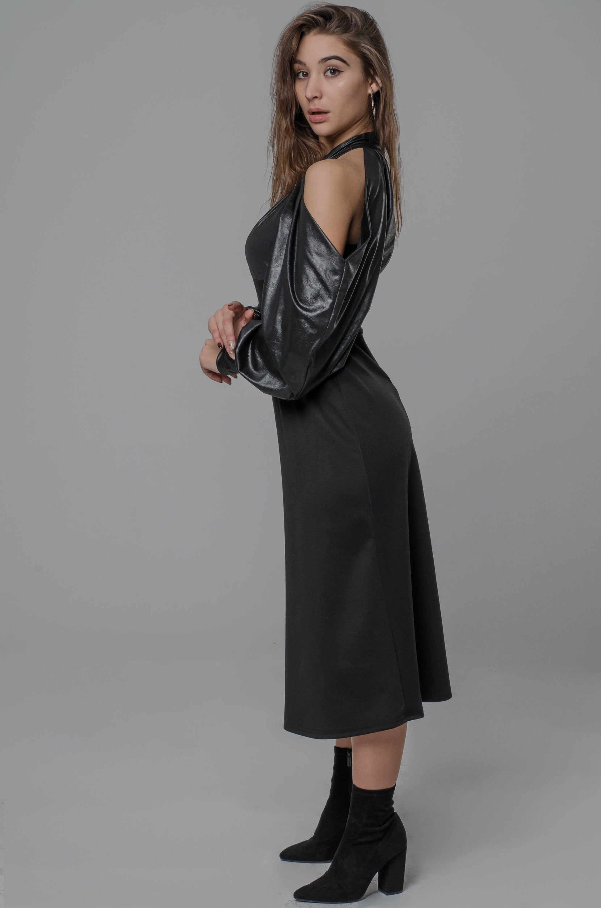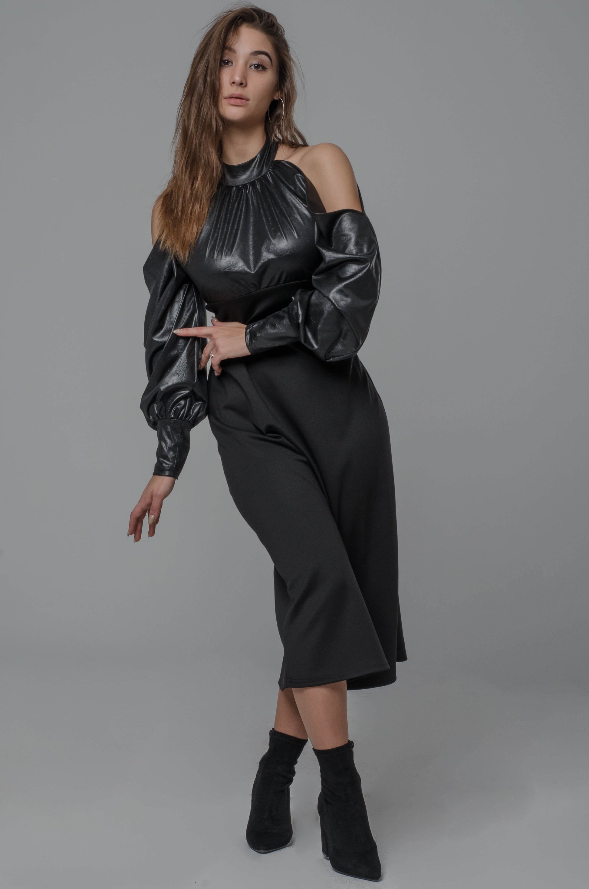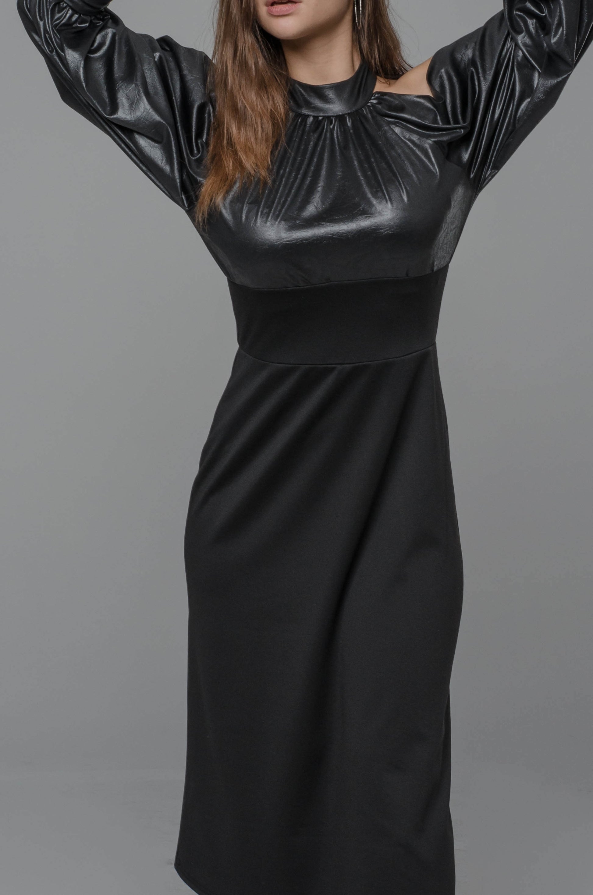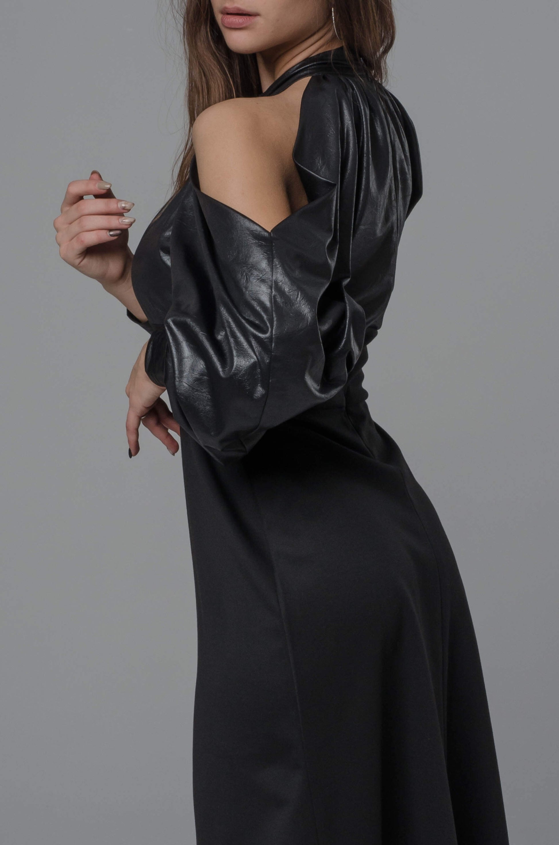 Długa, dopasowana linia pięknie modeluje sylwetkę, a kontrast materiałów — miękka ekoskóra na górze i elastyczna dzianina na dole — nadaje całości wyrazistego, modowego charakteru. Odkryte ramiona w połączeniu z długim rękawem z wycięciem tworzą efekt, który przyciąga uwagę bez jednej nuty przesady.