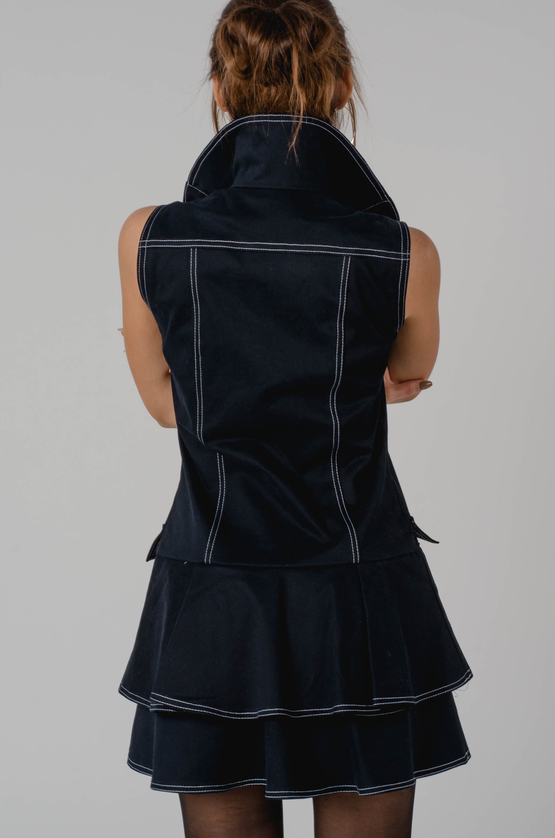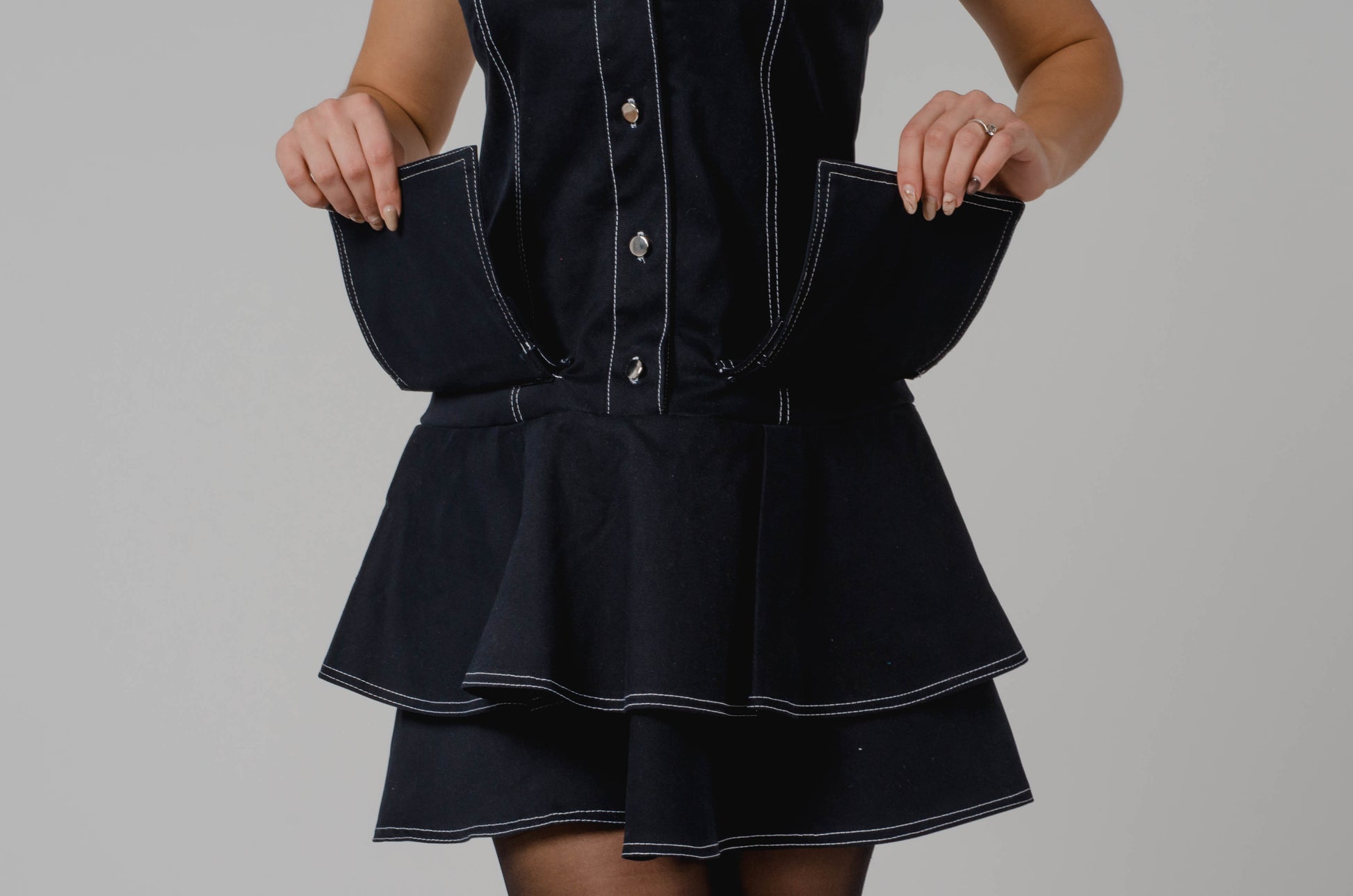 Zapinana z przodu na metalowe guziki tworzy mocną pionową linię, która wysmukla sylwetkę. Dół z dwiema falbanami dodaje ruchu i kobiecości, a kieszenie z klapkami przełamują klasyczną formę i nadają całości nowoczesny charakter.