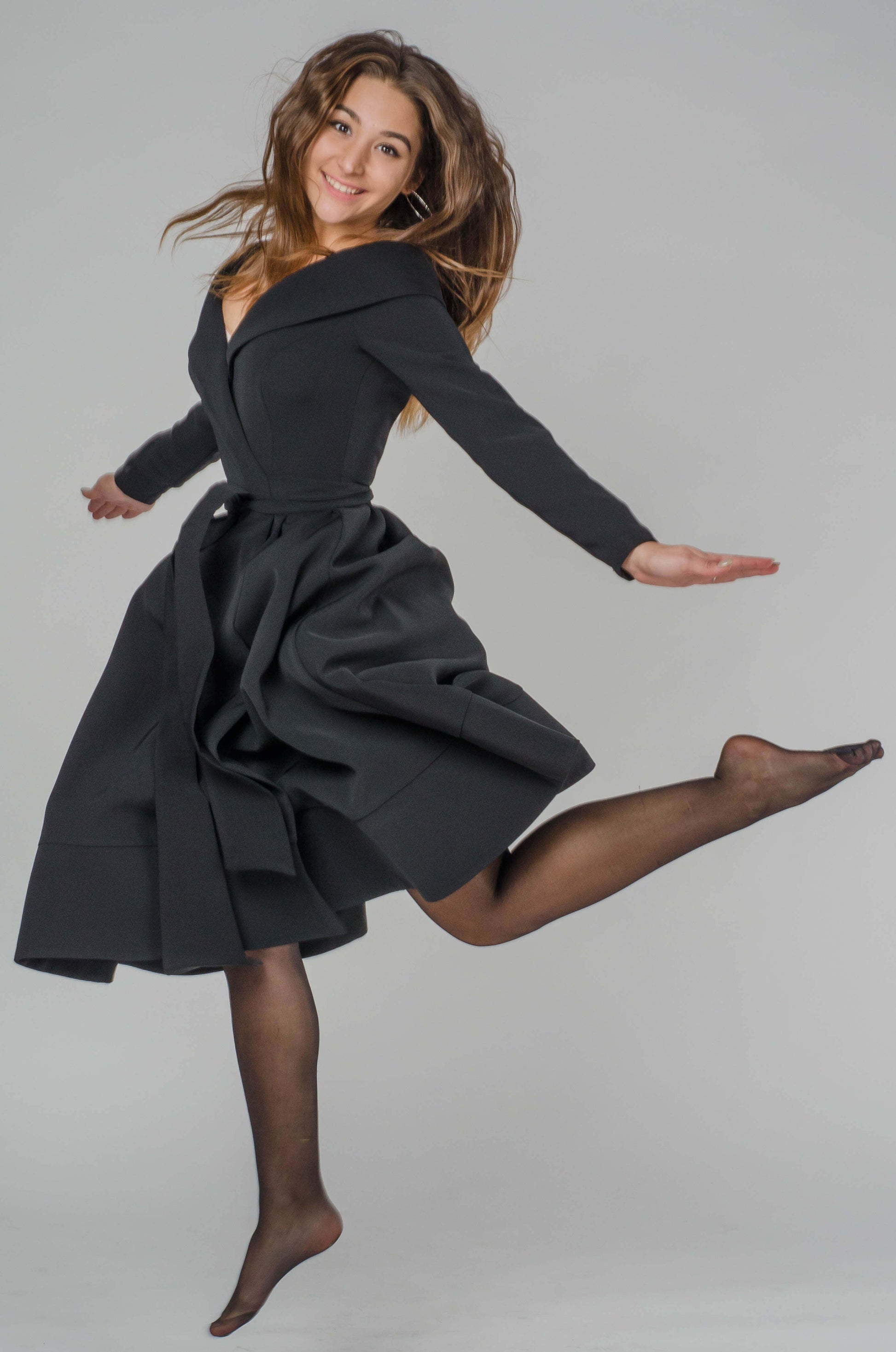 Tkanina: Krepa Francuska lekko elastyczna — materiał wyjątkowy pod każdym względem. Zwiewna, lekka, pięknie pracuje w ruchu i idealnie trzyma formę w części dopasowanej. Dzięki specyficznemu układowi włókien krepa ma naturalną odporność na zagniecenia — co oznacza w praktyce zero stresu i zero prasowania przed wyjściem. To jeden z tych materiałów, który wygląda premium bez wysiłku — w klubie, w barze, na wieczornej kolacji.