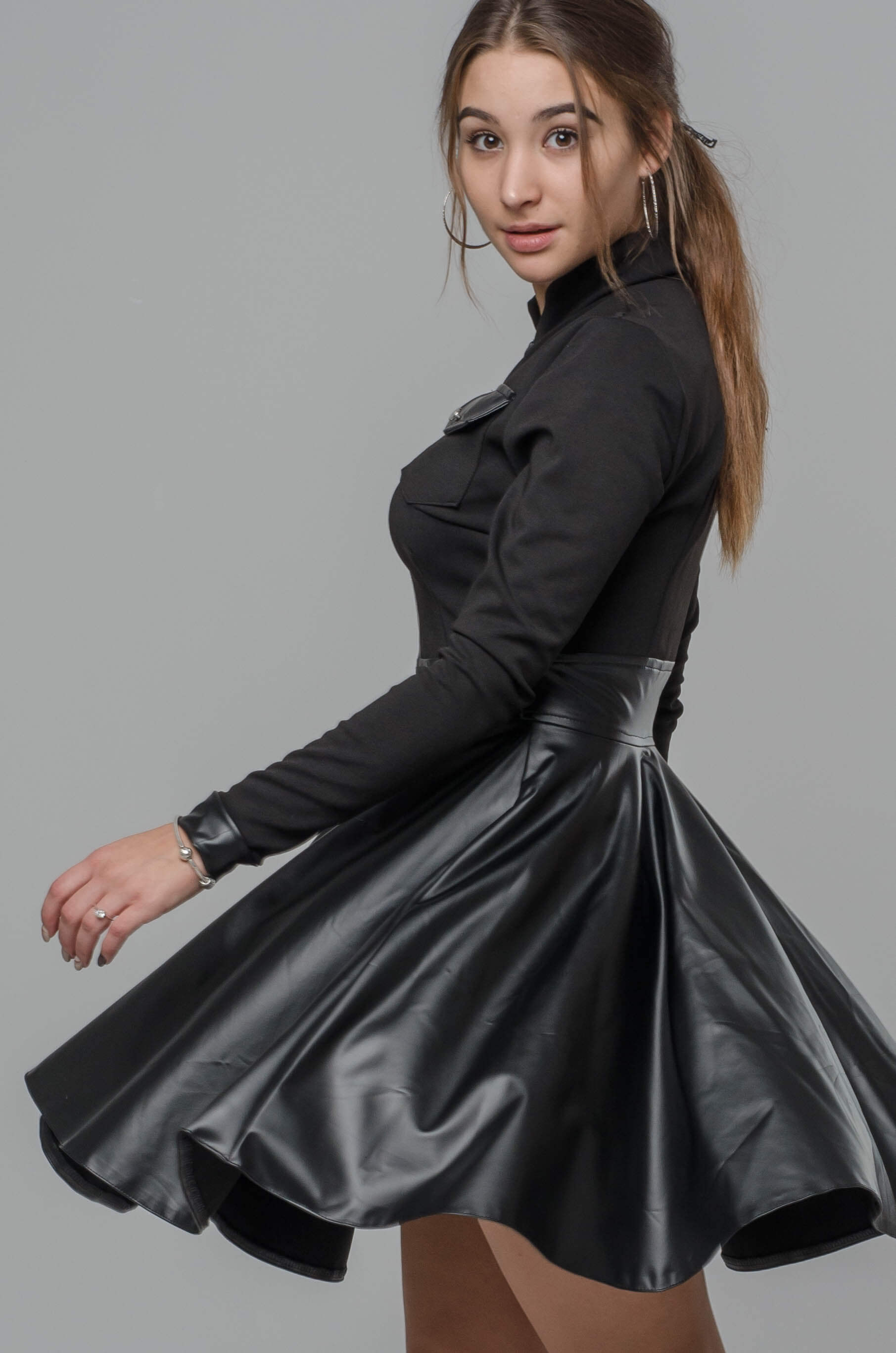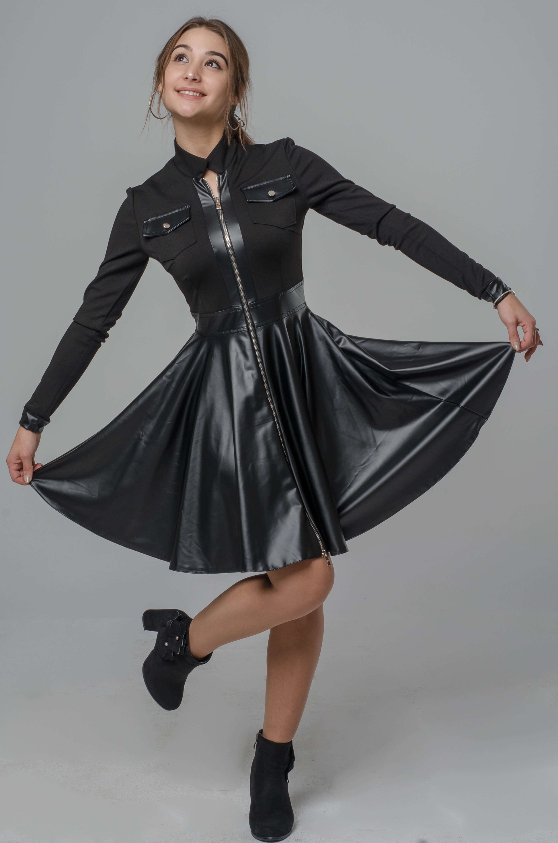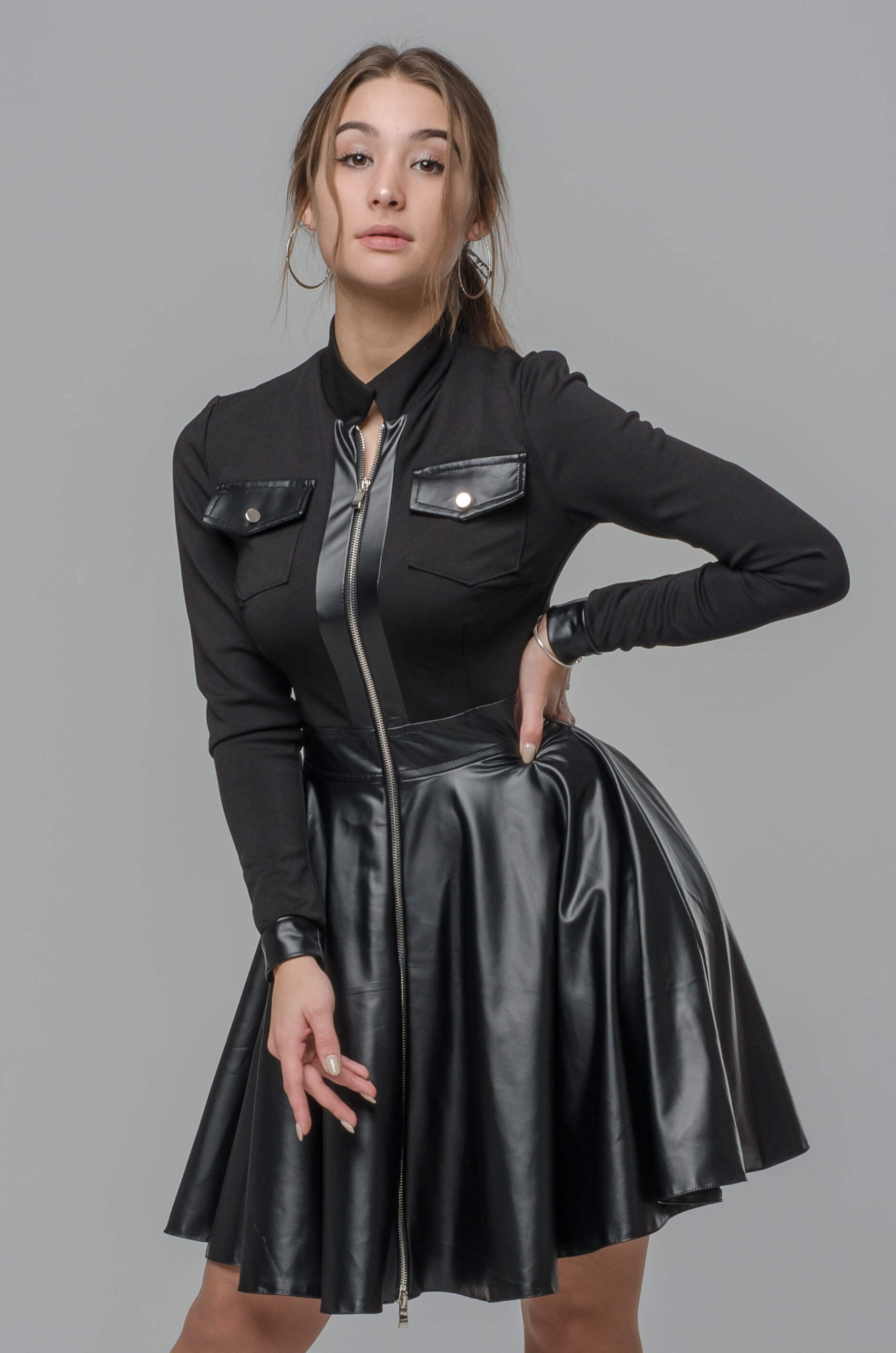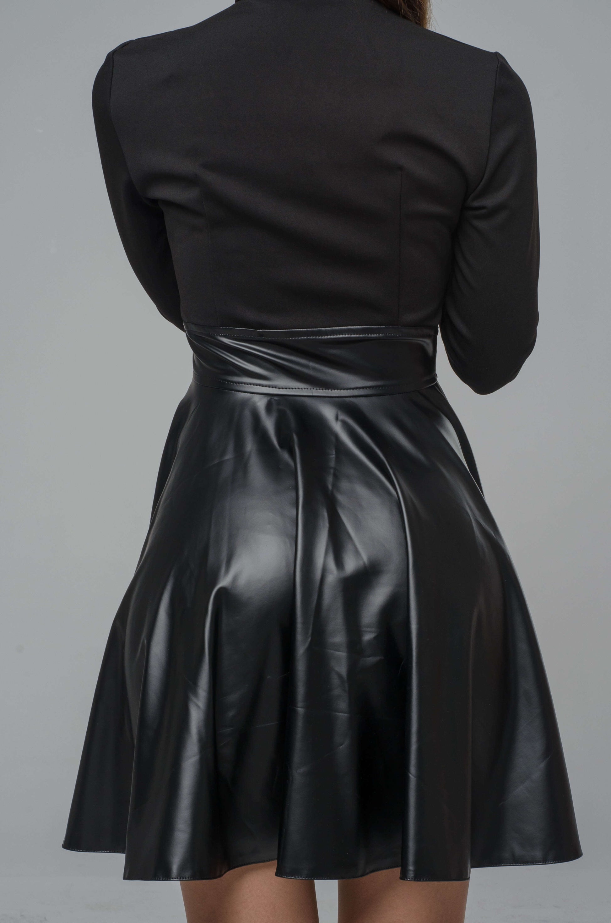 Ta sukienka została zaprojektowana tak, aby przyciągać uwagę w najbardziej oczywisty i jednocześnie najbardziej elegancki sposób. Błyszczący suwak z przodu działa jak element biżuteryjny, który prowadzi oko po sylwetce w linii pionowej — wydłużając ją optycznie. Góra wykonana z miękkiej dzianiny dopasowuje się do ciała i pięknie podkreśla biust, natomiast dół z ekoskóry w rozkloszowanej formie dodaje nuty drapieżnej nowoczesności. To idealny balans pomiędzy sensualnością a luksusową mocą.