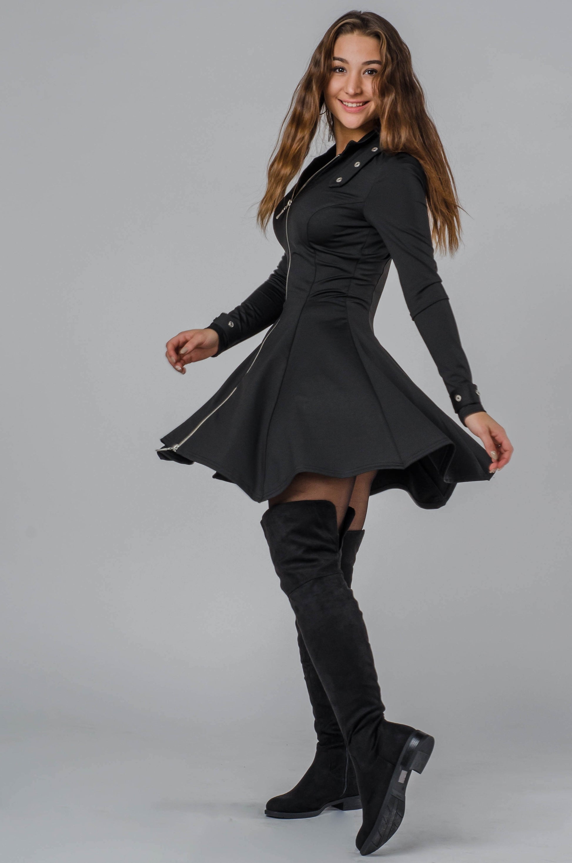 Są takie momenty, kiedy kobieta nie chce być “ładna”. Chce wejść i ustawić cały klimat pomieszczenia pod siebie. Ta czarna sukienka robi dokładnie to. Dopasowana góra podkreśla talię i biust, a rozkloszowany dół dodaje lekkości przy każdym kroku. Nie musisz przesadzać z dodatkami — błyszczący zamek z przodu robi za biżuterię. Ten jeden element daje efekt “czy ona jest influencerką, czy gwiazdą wieczoru?”. I nie musi nawet odpowiadać — bo to widać bez słów.