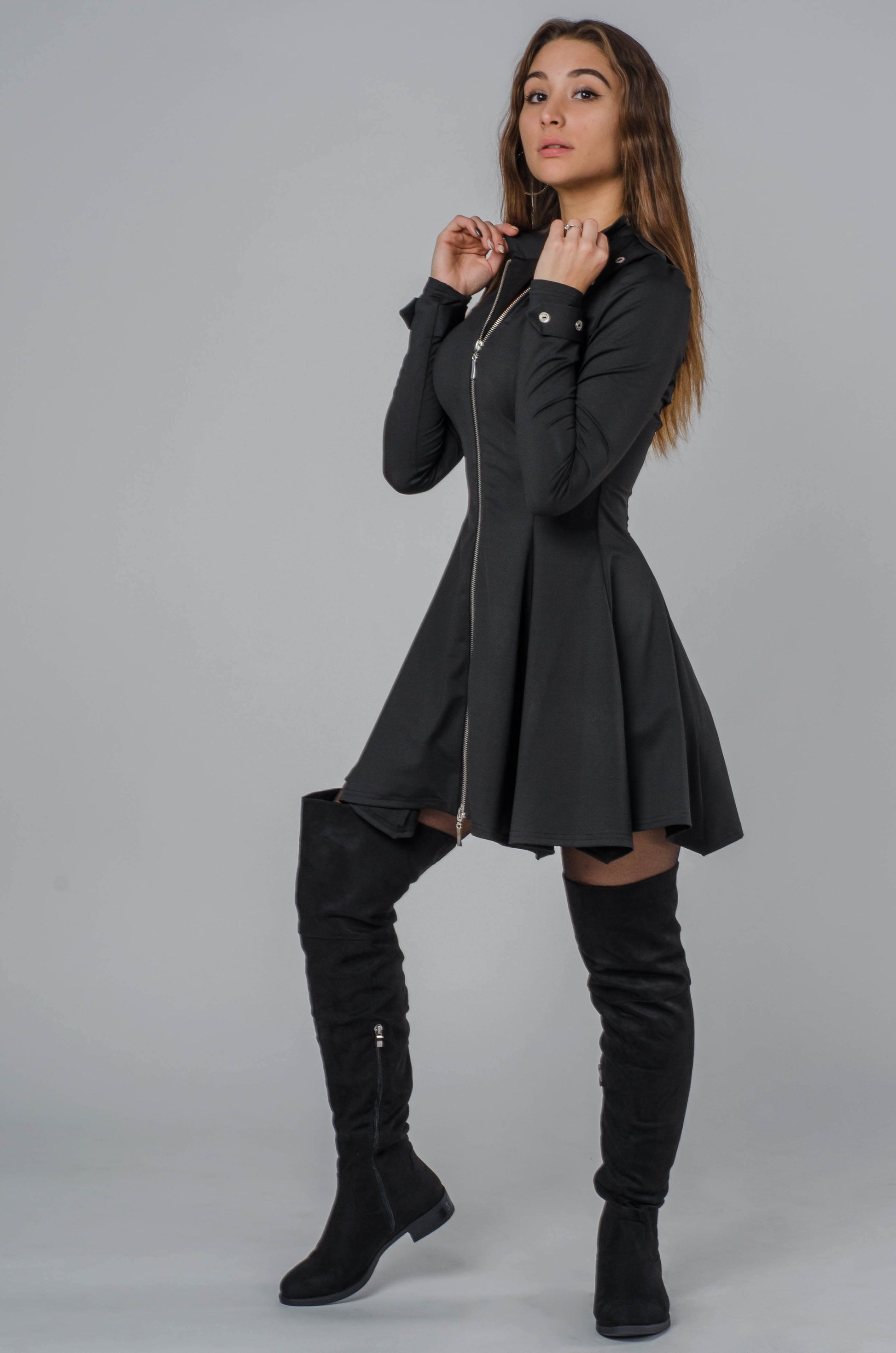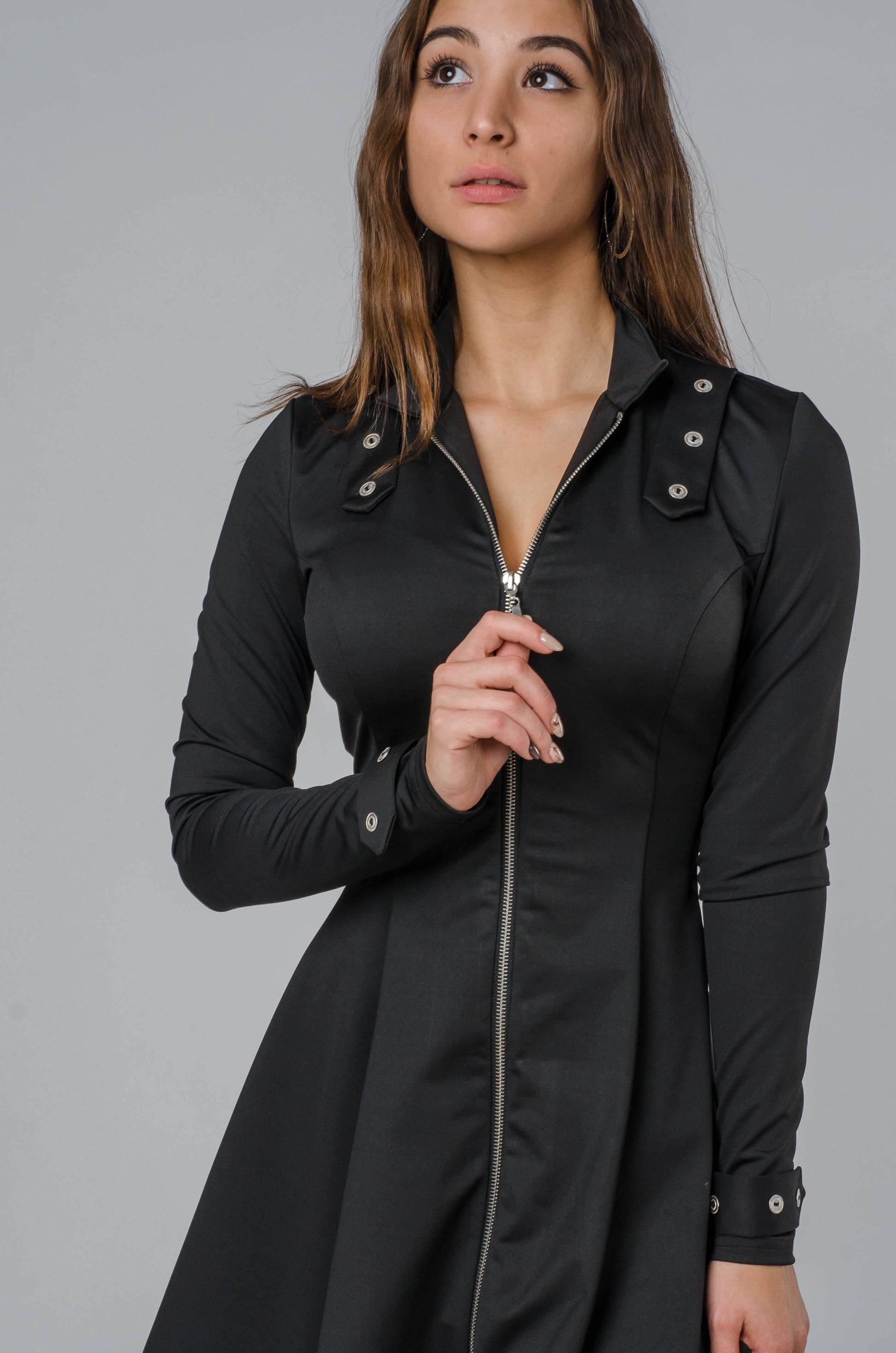To produkt wykonany lokalnie, z dbałością o detale konstrukcyjne i jakość szycia. Zamek z przodu przyciąga uwagę, odbija światło i daje luksusowy połysk — to element, który realnie definiuje tę sukienkę wizualnie. Ten kontrast błysku i czerni tworzy efekt w stylu “red carpet but urban club edition”. Właśnie dlatego ta sukienka jest idealna do zdjęć i filmów w socialach — światło robi tutaj robotę samo.