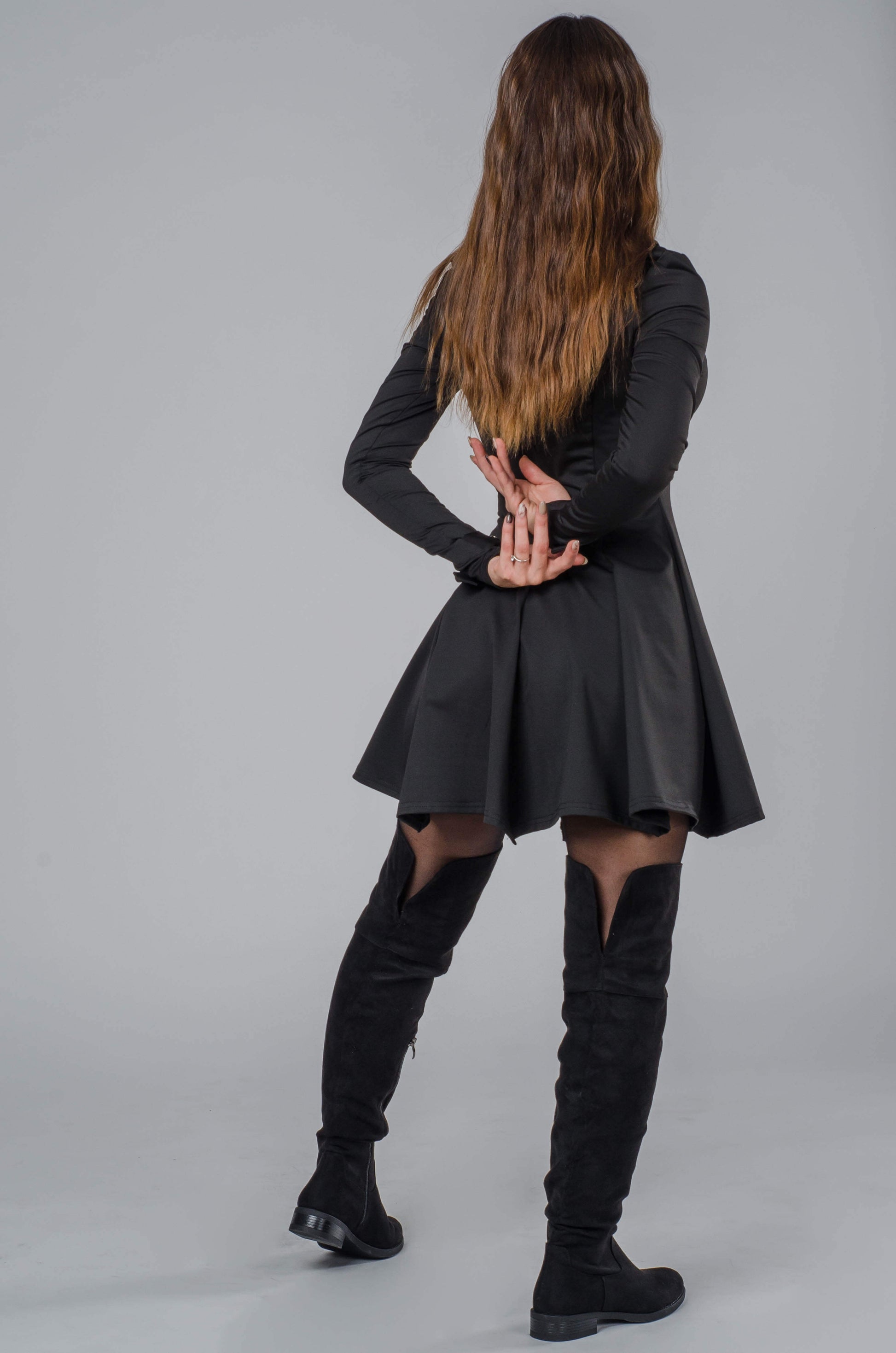 Góra jest gładka, dopasowana i stabilna — trzyma formę i trzyma sylwetkę. Nie ma tu przypadkowych fałdek, naciągnięć czy chaosu. Sukienka zasługuje na miano premium, bo robi robotę samą w sobie. Rozkloszowany dół dodaje lekkości, swobody i kobiecego flow w ruchu. To z tego połączenia powstaje efekt: smukła talia + dynamiczny dół, który pięknie pracuje w trakcie chodzenia, tańca, obrotu i każdego “przypadkowego” spojrzenia w stronę baru.