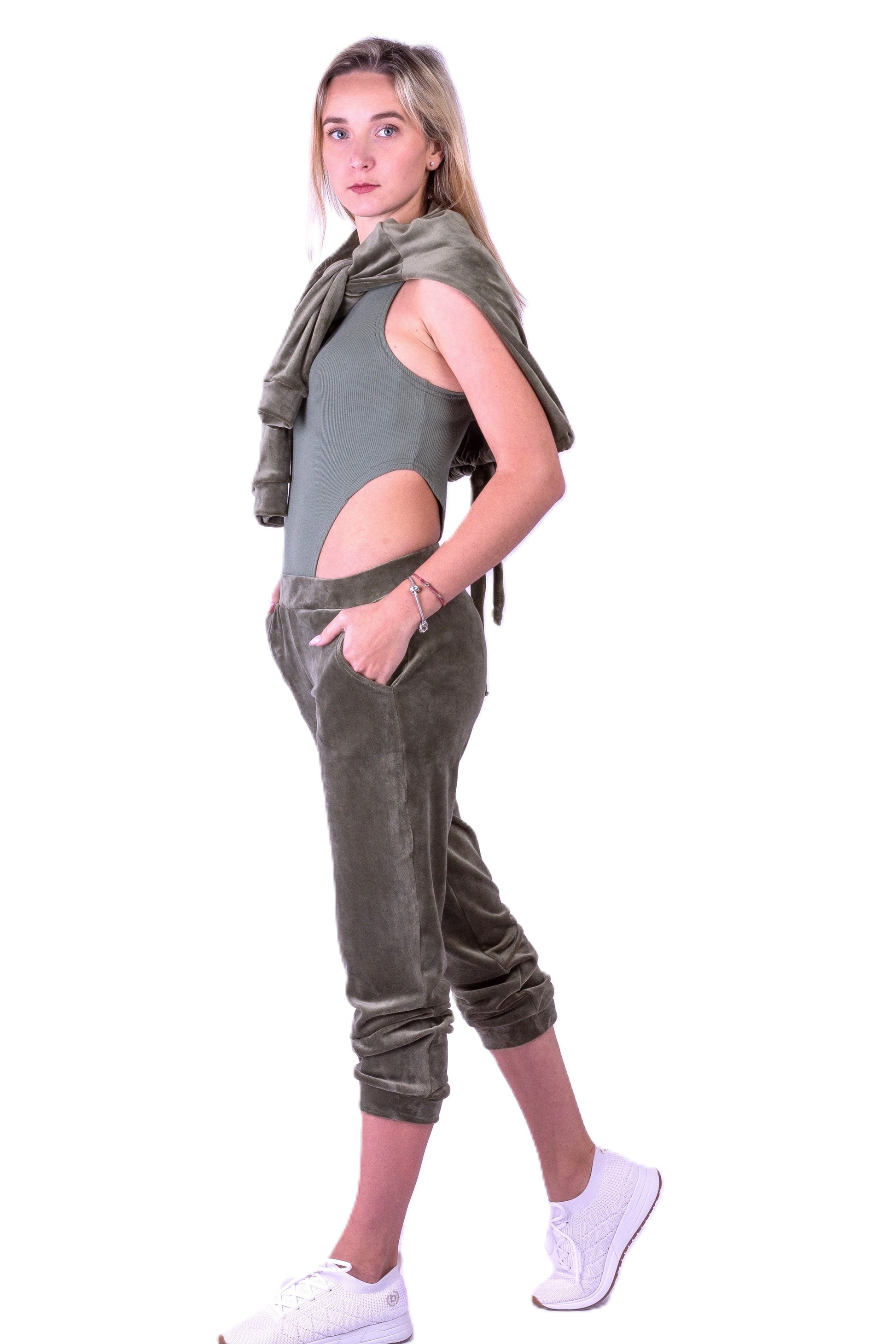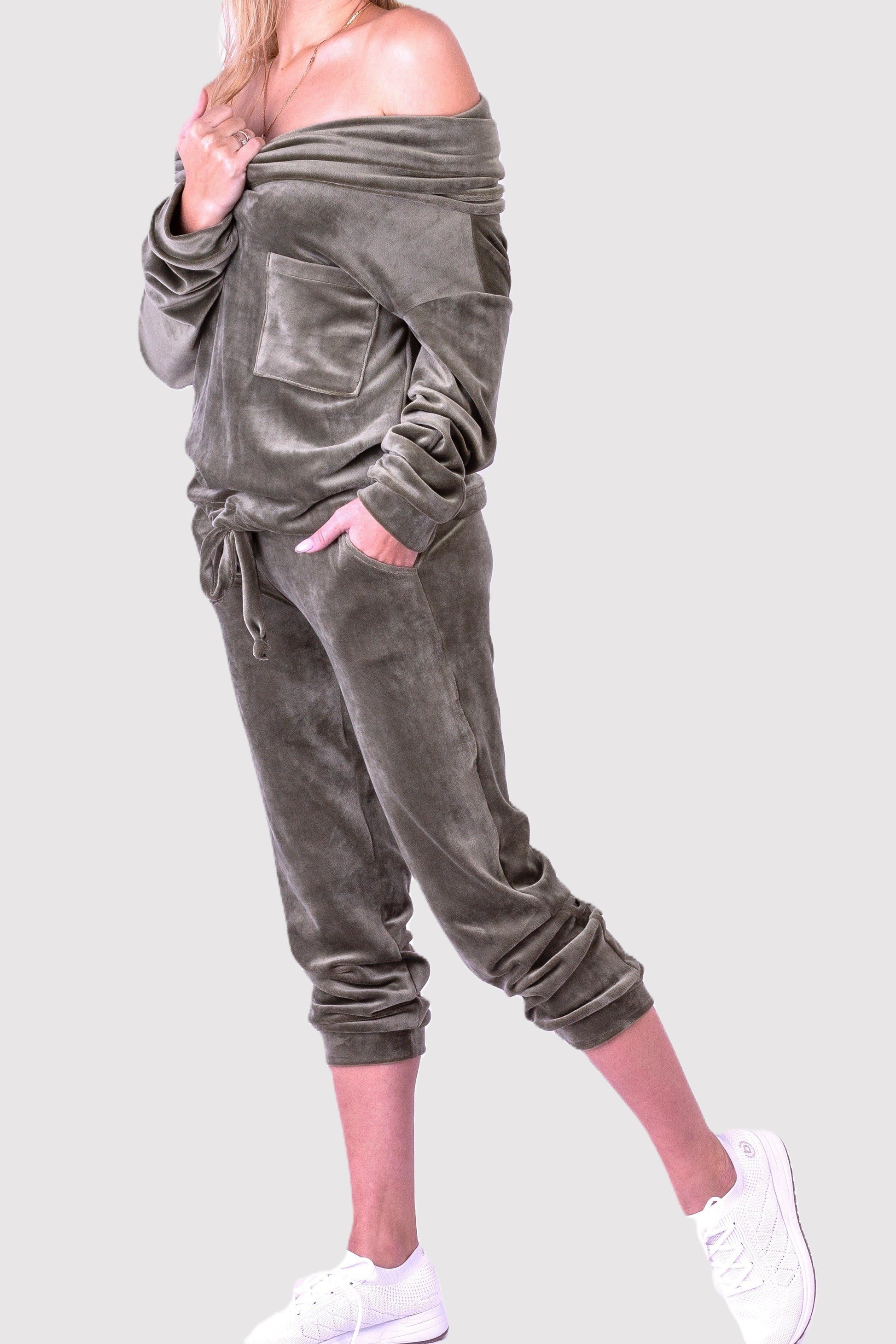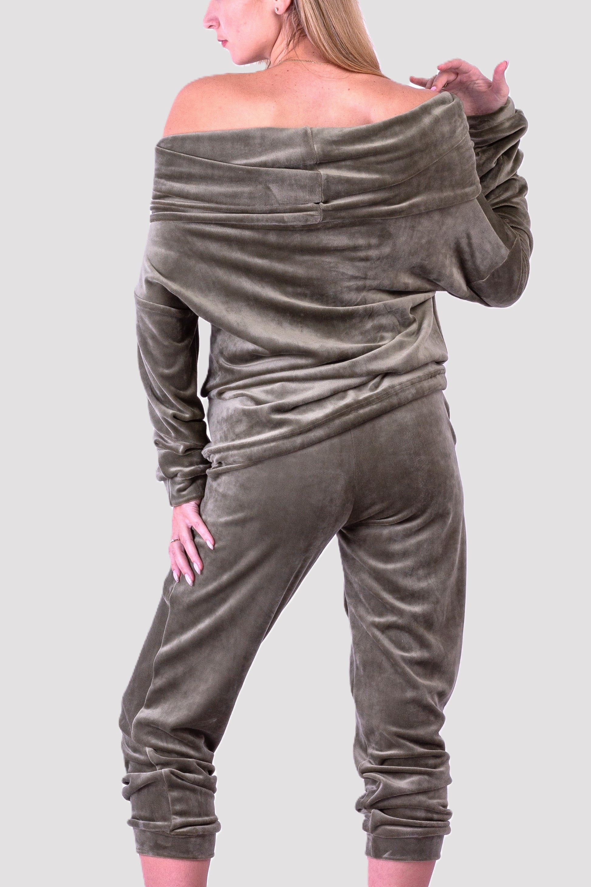 Dres welurowy damski komplet bluza opuszczany na ramionach + spodnie oliwkowy S54