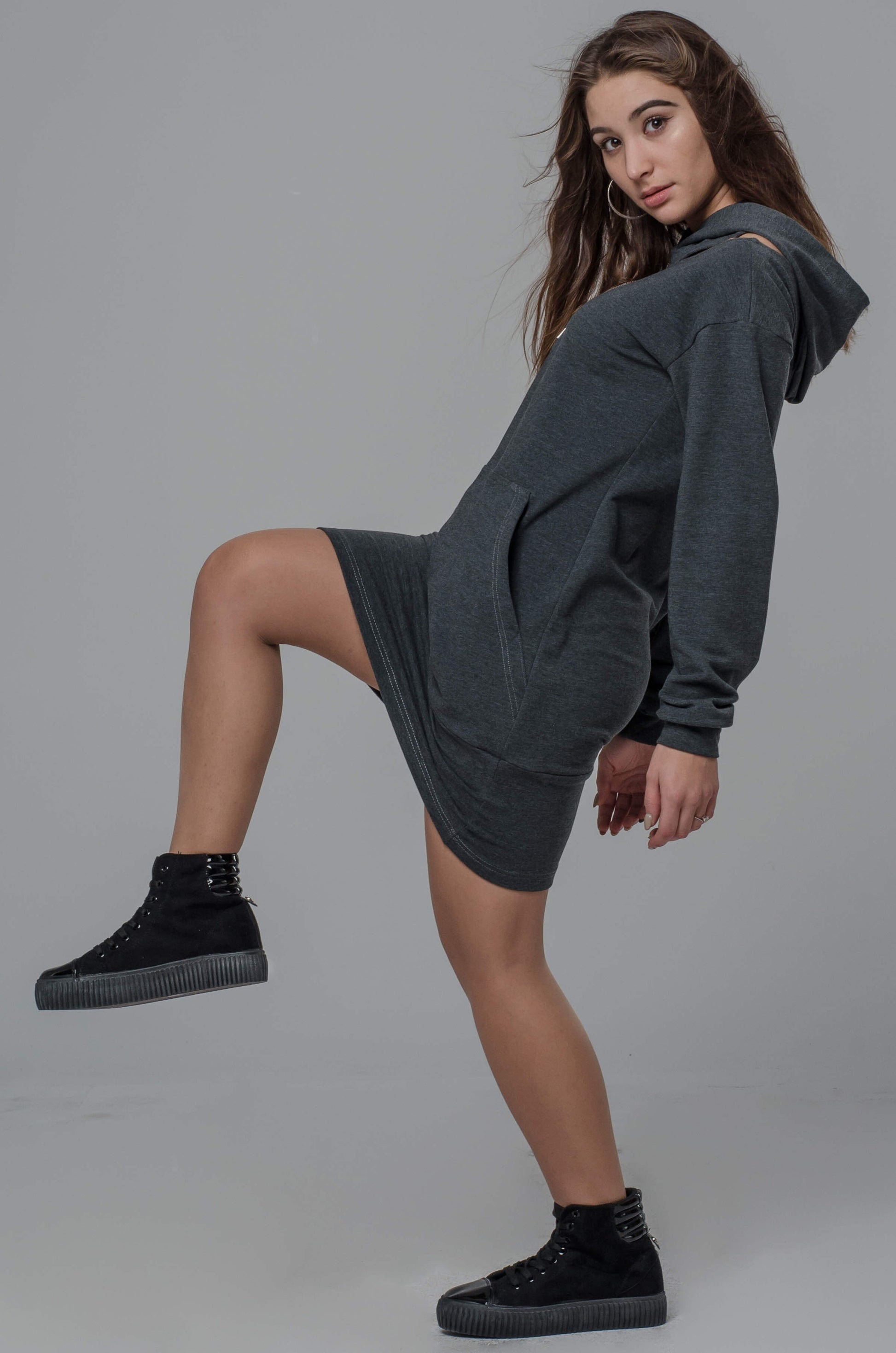 Kaptur i kieszeń kangurka nadają jej sportowy vibe, metalowy zamek dodaje rockowego akcentu, a wycięcia na ramionach przełamują klasyczny fason i wprowadzają kobiecą świeżość. Długie rękawy równoważą całość, dzięki czemu sukienka jest idealna zarówno na co dzień, jak i na wieczorne wyjścia w streetstylowym klimacie.